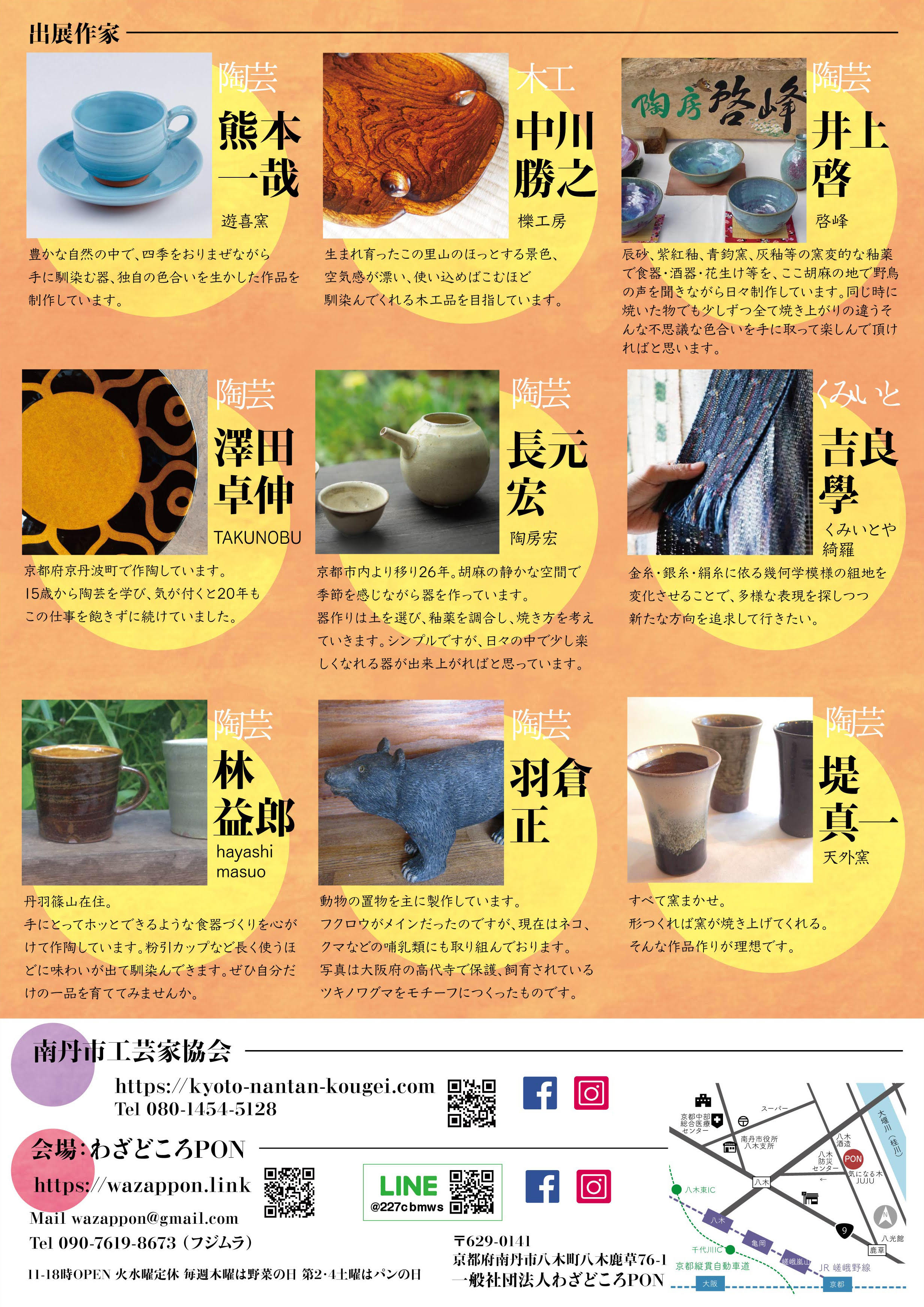 南丹市八木町のわざどころPONにて「南丹市工芸家協会展〜手しごとのぬくもり〜」を開催いたします。